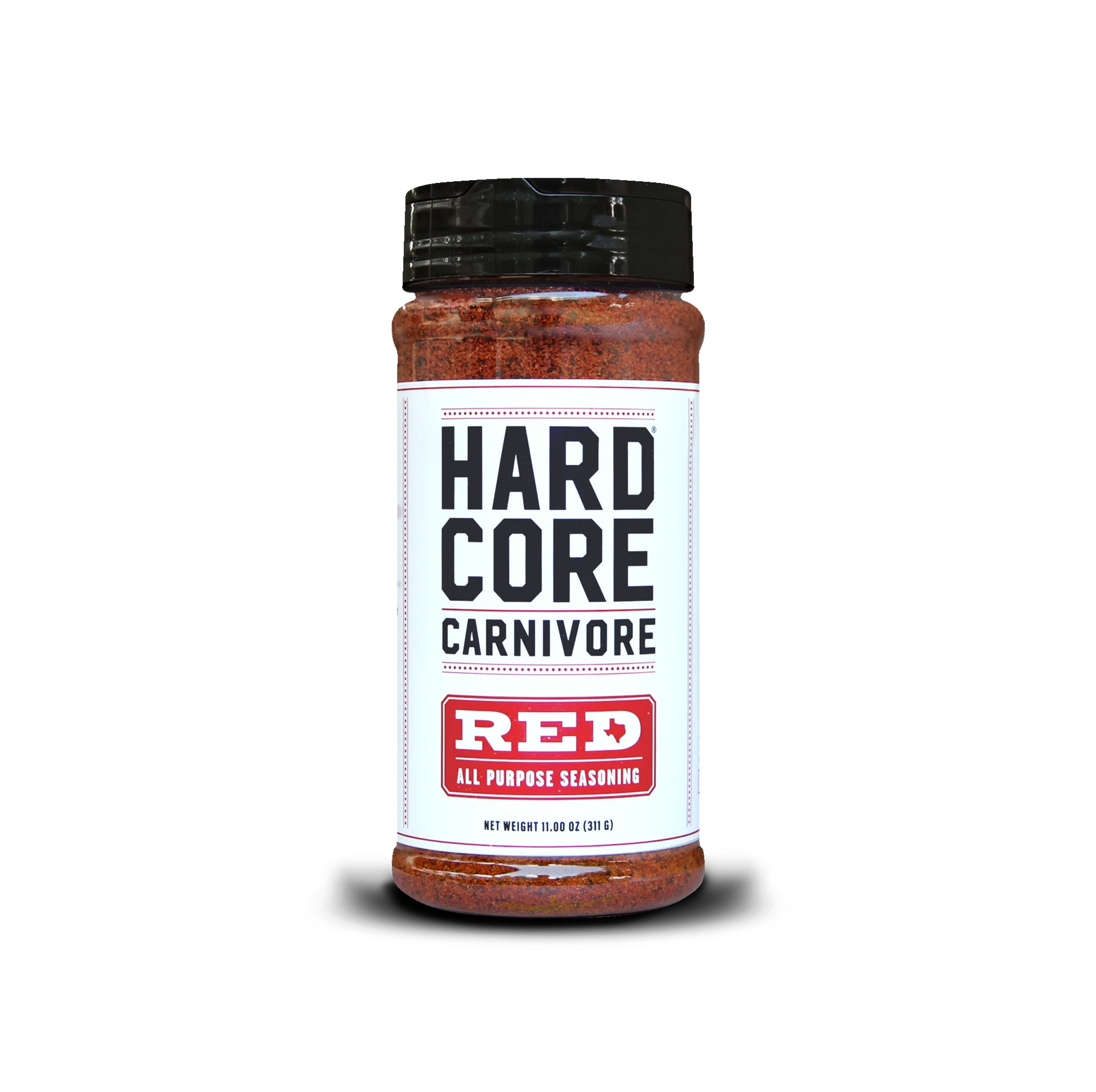 Hardcore Carnivore Red is our workhorse all-purpose rub, with a blend of classic spices like garlic, black pepper, paprika and just a hint of heat. And that vivid color? Totally natural. We love using it on pork and chicken, and it's also a best-keep secret amongst competition BBQ teams. Flavor profile: a coarse blend of classic spices like garlic, black pepper and paprika with just a hint of heat. Hardcore Carnivore Red is: Gluten Free, No MSG, No artificial colors. CONTAINS: Sea Salt, White Sugar, Black Pepper, Dehydrated Garlic, Paprika, Dehydrated Onion, Chili Powder (Chili Pepper, Salt, Cumin, Oregano and Garlic), Natural Flavor, and Silicon Dioxide (Less than 2% used for anti-caking). Net weight: 11 oz