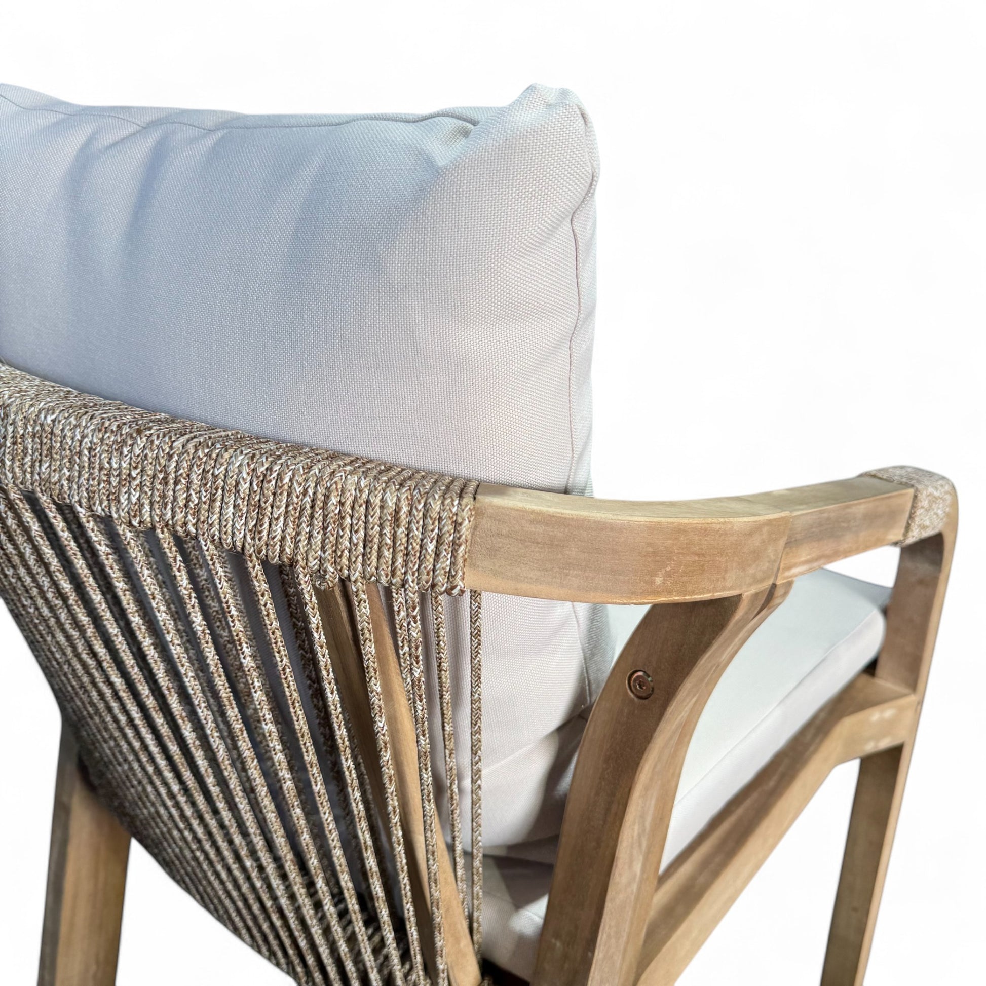 Each chair is finished with hand-woven marine rope detailing, adding texture, support and contemporary style while remaining durable and fade-resistant. The chairs include plush cream-coloured outdoor cushions, designed for comfort and a light, coastal aesthetic. The neutral cushions complement the natural timber tones and are perfect for both modern and classic outdoor spaces.