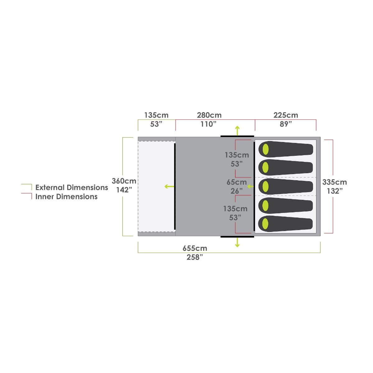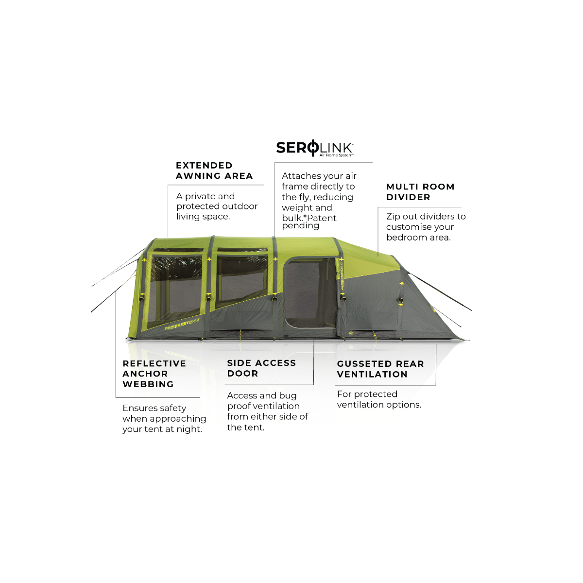 Winner of a highly commended award at the 2022 Camping Magazine Awards, our Evo TL V2 has been carefully crafted for comfort and flexibility. With a spacious full head-height living area, large front awning area, and versatile Multi-Room bedroom system, this popular air tent is sure to also be a winner with families and small groups. The size, layout and inflatable airframe make it a perfect set-up for longer holidays with a small family with the additional options of linking to an Aerobase 3 Shelter for even more outdoor living space.